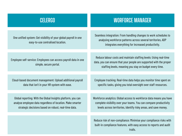 ADP Celergo is uniquely designed to provide payroll functions for global enterprises with dispersed teams. On the other hand, Workforce Manager is designed to integrate with payroll, helping large global businesses simplify their day-to-day workforce management. Its fully integrated, workforce-centred features streamline much of the admin burden of running global teams.