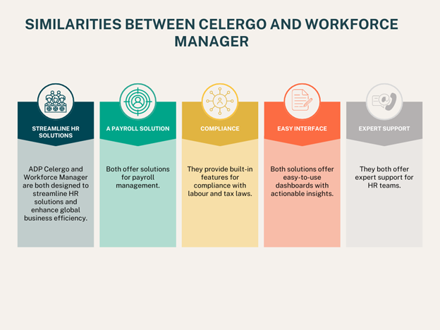 Celergo and Workforce Manager share several similarities that are significant for businesses focusing on efficient and effective human resource management. Both platforms offer comprehensive solutions that streamline payroll processing and human resource management across different countries, demonstrating strong capabilities in handling complex, global workforce requirements.